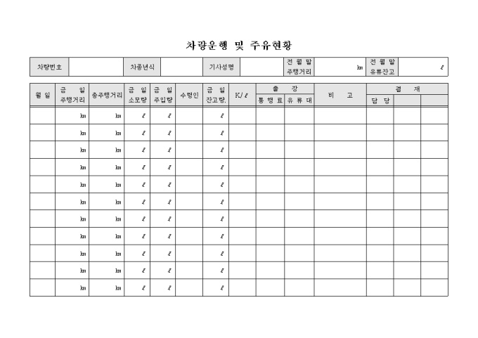 차량의 운행현황과 주유현황을 날짜별로 기입할수 있도록 만들어진 문서입니다.