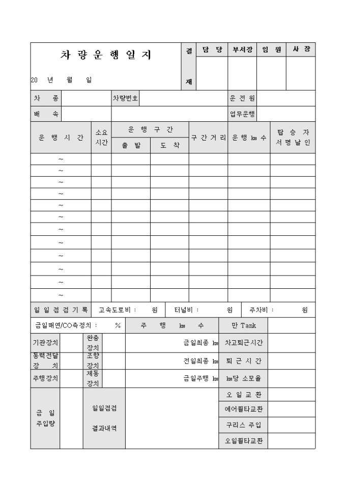 9,000원/월차량운행일지입니다. 차량을 운행하며 시간별로 운행구간의 거리, 출발과 도착등을 기록할수 있는 문서입니다.