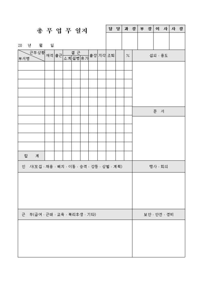 총무부에서 사용하는 일반적인 총무업무 일지입니다.부서별 인원과 출결사항등 으로 구성되어 있습니다.
