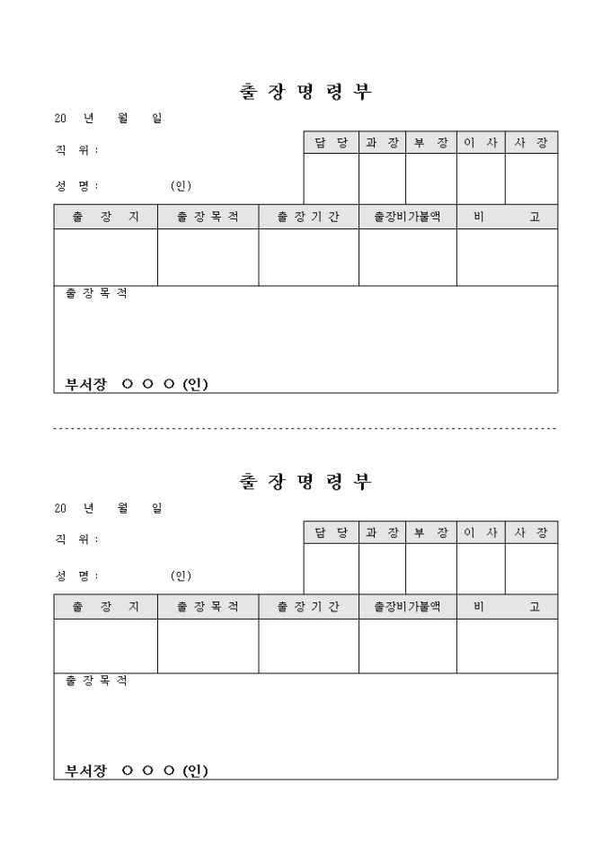 회사에서 사용하는 출장명령부입니다. 출장명령에 필요한 목적, 기간, 교통편, 출장료등으로 구성되어 있습니다.