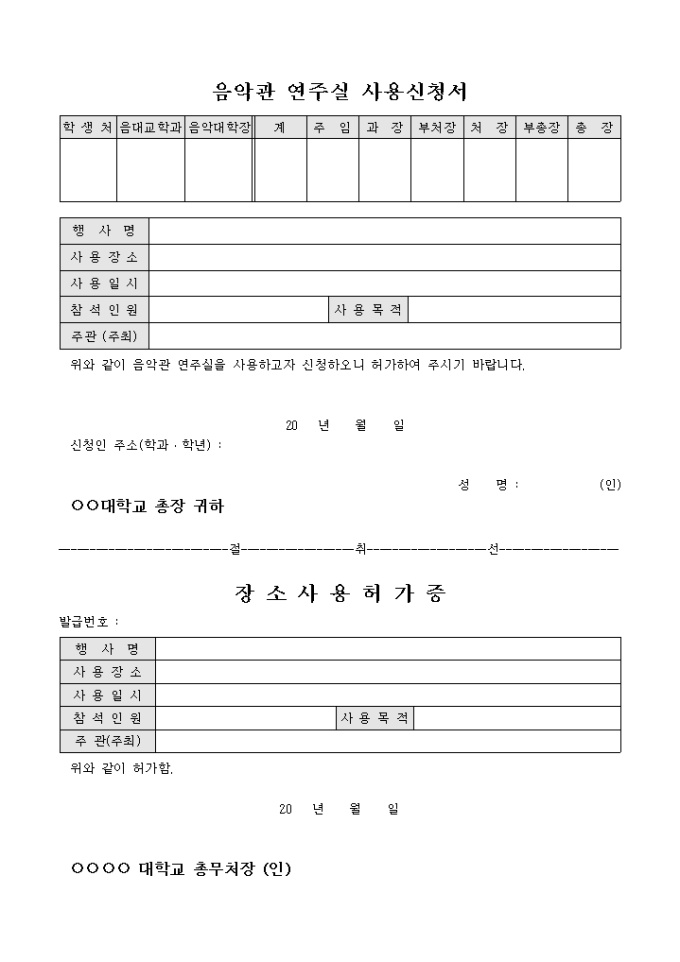 9,000원/월음악관 연주실을 사용하기 위해 제출하는 신청서류입니다. 신청서와 허가증으로 구성되어 있습니다.