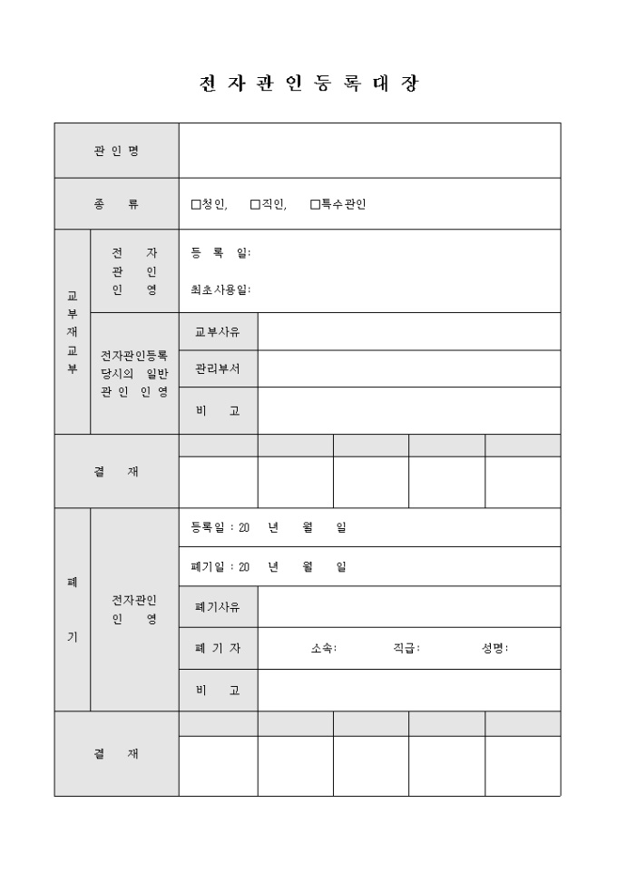 전자관인을 등 하거나 폐기할때 사용하는 등록대장입니다. 관인명과 관인의종류, 폐기 기록으로 구성되어 있습니다.