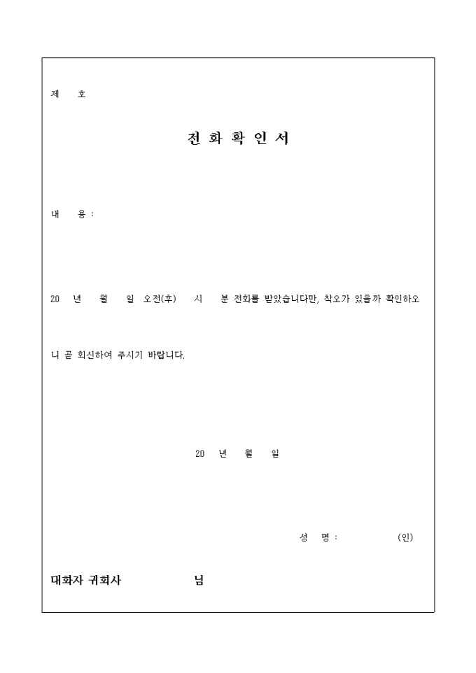 9,000원/월전화의 내용을 다시 확인하기위해 사용되는 문서입니다. 전화의 내용과 날짜, 회신의 글귀로 구성되어 있습니다.