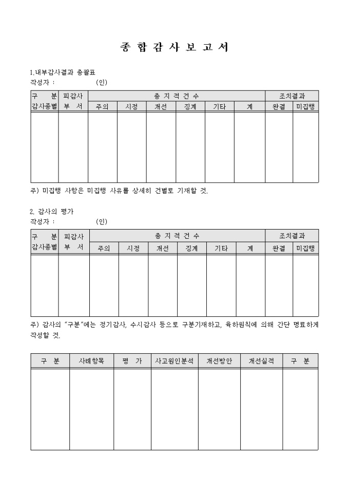 감사결과를 보고서 형식으로 만들어 놓은 문서입니다. 내부감사결과 총괄표와 감사의 평가등으로 구성되어 있습니다.