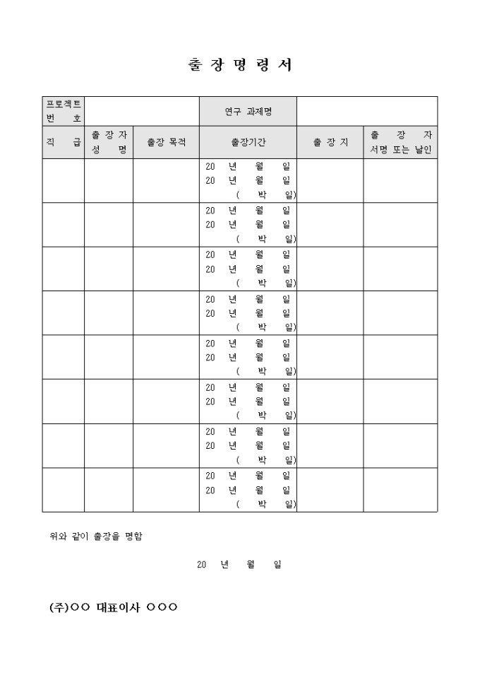 9,000원/월출장명령서입니다. 출장자와 기간, 출장목적등으로 구성되어 있습니다.