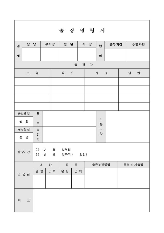 9,000원/월출장명령서입니다. 출장자와 기간, 출장비등으로 구성되어 있습니다.
