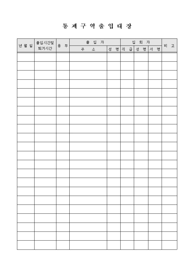 통제구역출입시 기록을 남기기위해 사용되는 문서입니다. 출입시간, 퇴거시간, 용무, 출입자등으로 구성됩니다.
