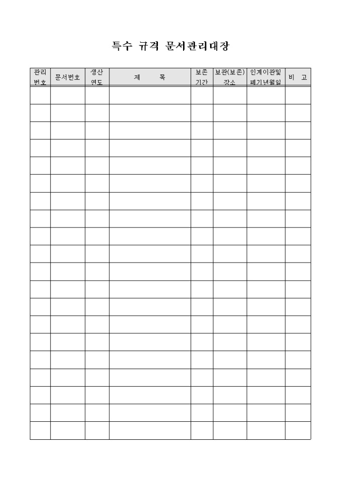 9,000원/월특수규격문서관리대장입니다. 특수규격의 문서를 관리할때 사용되는 문서입니다.