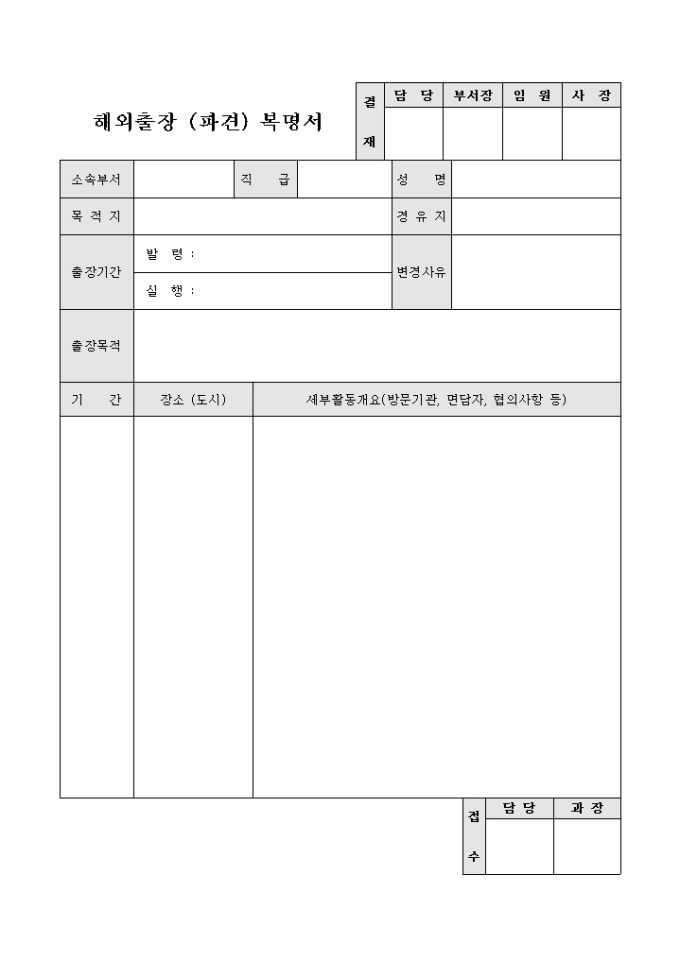 9,000원/월해외출장파견복명서입니다. 해외출장이나 파견시 사용됩니다.