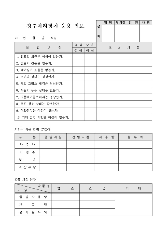 정수처리장치운용일보입니다. 점검내용과 조치사항, 사용현황, 약품사용현황등으로 구성되어 있습니다.