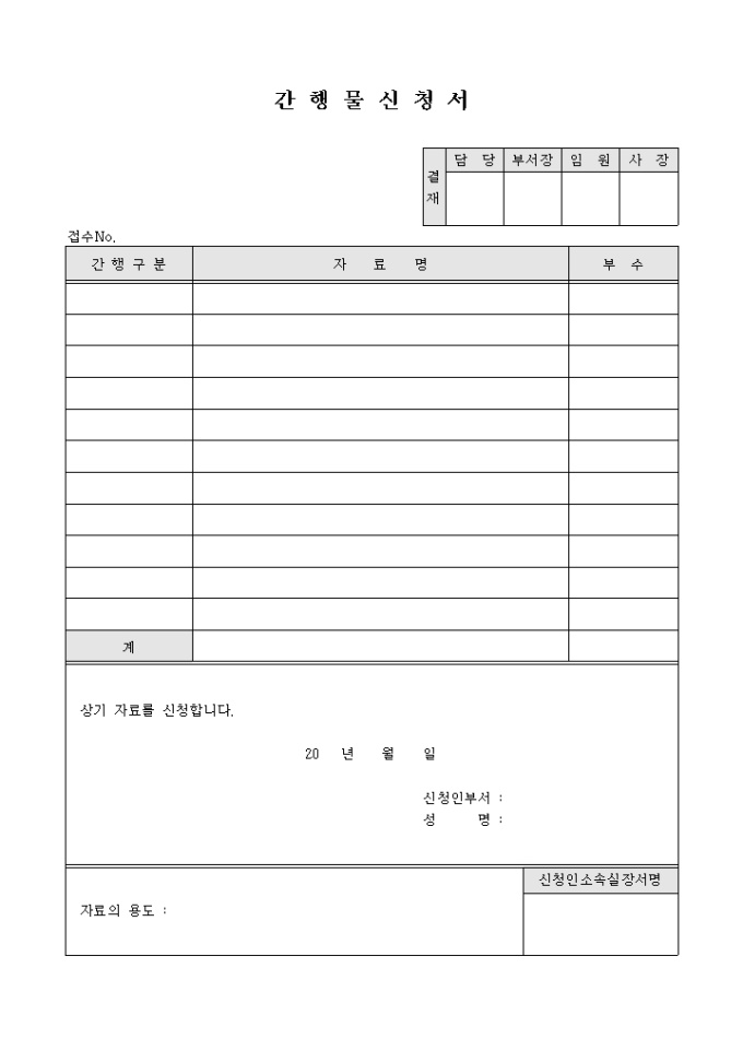 간행물 신청서 양식입니다. 간행구분과 자료명, 부수, 자료의 용도 등을 기재할 수 있습니다.