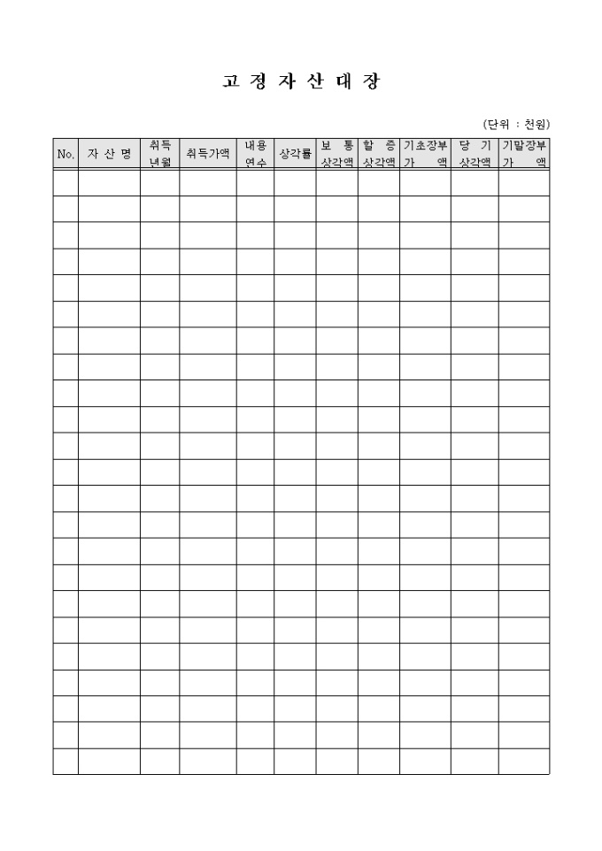 9,000원/월고정자산의 관리를 위한 고정자산대장 양식입니다. 자산명, 취득년월, 취득가액, 내용연수, 상각률, 보통상각액, 할증상각액 등의 항목으로 구성되어 있습니다.