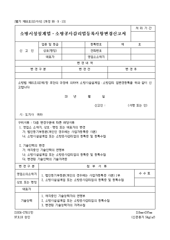 소방법 제65조의2제1항 후단의 규정에 의하여 소방시설설계업․소방감리 업변경등록을 위와 같이 신고하실때 사용하는 양식입니다.