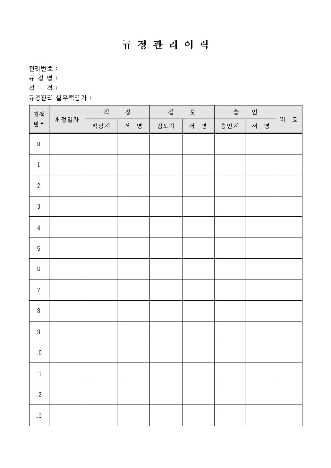 9,000원/월해당 규정의 개정시 이들을 관리 하기 위한 규정관리이력표 양식입니다. 관리번호, 규정명, 개정일자, 작성, 검토, 승인 등의 항목으로 구성되어 있습니다.