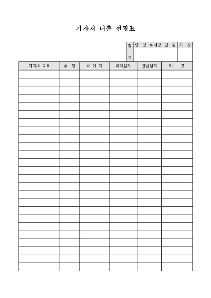 9,000원/월기자재대출 현황표 양식입니다. 기자재목록, 수량, 대여자, 대여일자, 반납일자 등을 기재 할 수 있습니다.