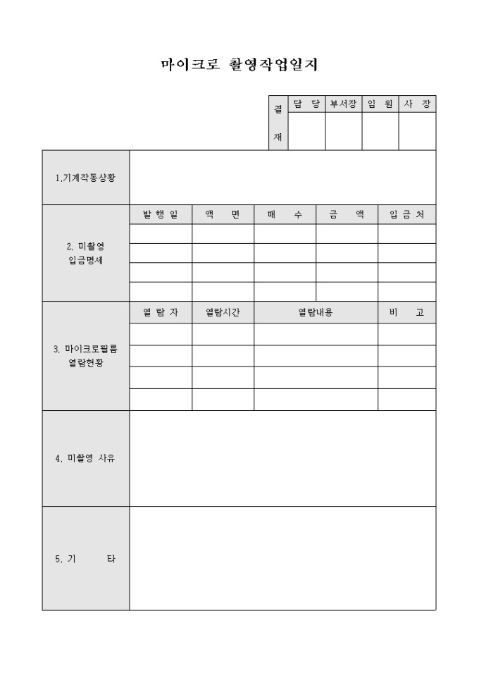 마이크로 촬영 작업일지 양식으로 기계작동상황, 미촬영 입금명세, 마이크로 열람현황, 미촬영 사유 등의 항목을 기재할 수 있습니다.