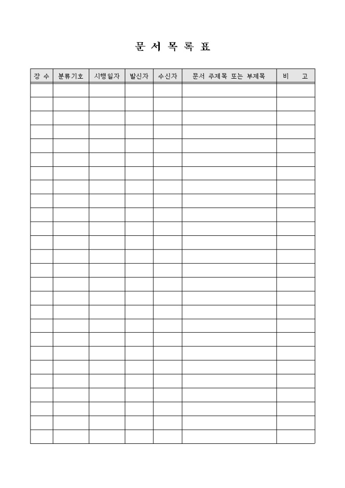 문서의 관리를 위한 문서목록표입니다. 분류기호, 시행일자, 발신자, 수신자, 문서 주제목 및 부제목 등의 항목으로 구성되어 있습니다.