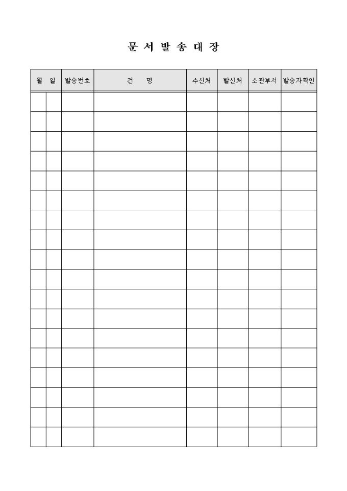 9,000원/월문서 발송에 대해 기록/관리 할 수 있는 문서발송대장(6) 양식입니다. 월일, 발송번호, 건명, 수신처, 발신처, 소관부서, 발송자 확인 등의 항목으로 구성되어 있습니다.