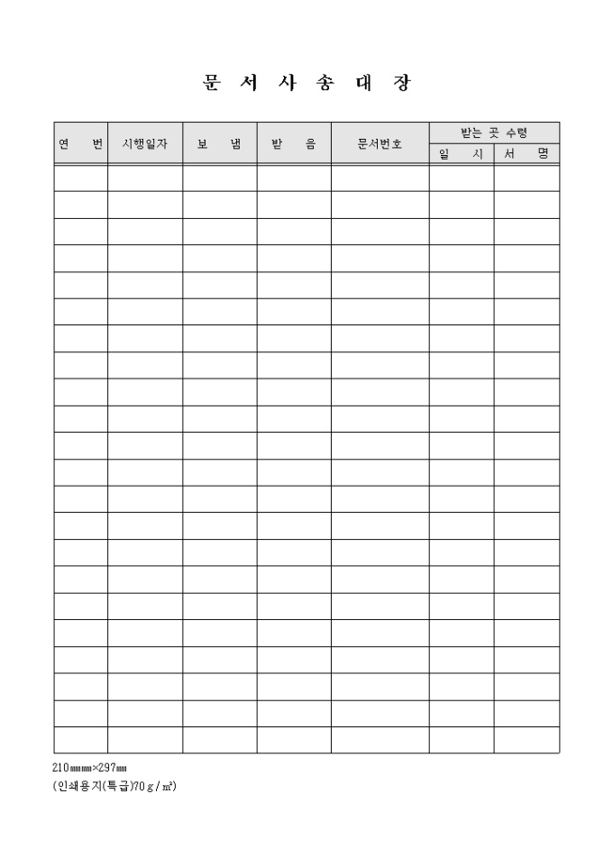 9,000원/월문서사송대장 양식입니다. 연번, 시행일자, 보냄, 받음, 문서번호, 받는곳 수령 등의 항목으로 구성되어 있습니다.