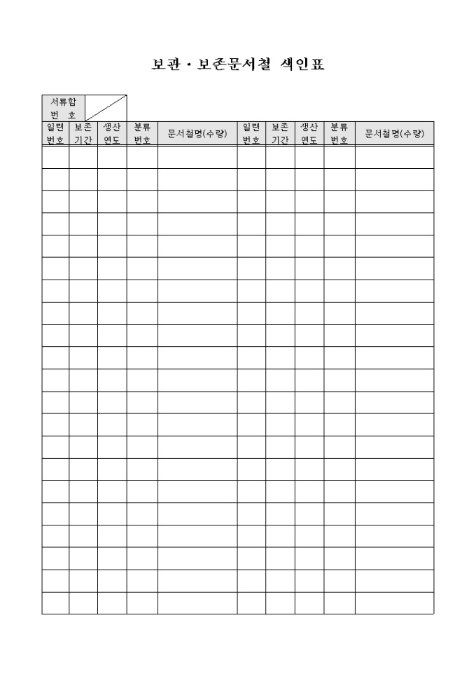 9,000원/월문서의 보관·보존을 위한 보관·보존문서철 색인표 양식입니다. 일련번호, 보존기간, 생산연도, 분류번호, 문서철명(수량) 등의 항목으로 구성되어 있습니다.