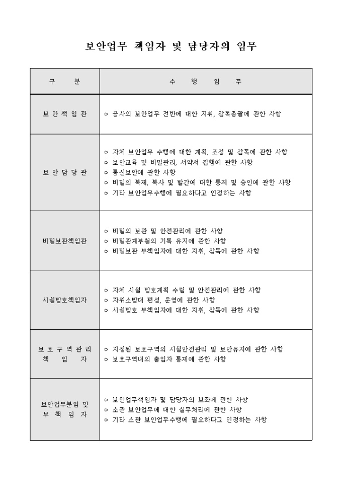 보안업무책임자및담당자의임무목록표