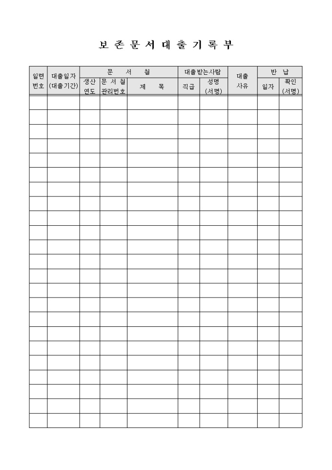 9,000원/월보존문서의 대출현황을 기록하기 위한 보존문서 대출기록부 양식입니다. 대출일자, 문서철, 대출받는 사람, 대출사유, 반납 등의 항목으로 구성되어 있습니다.
