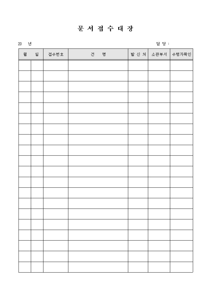 9,000원/월문서접수현황을 기록/ 관리할 수 있는 문서접수대장입니다. 문서접수번호, 건명, 발신처, 소관부서 등의 항목으로 구성되어있습니다.