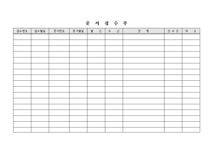문서를 접수할 때 사용할때 접수번호, 접수일, 문서번호, 건명 등의 항목을 기입할 수 있는 문서접수부입니다.