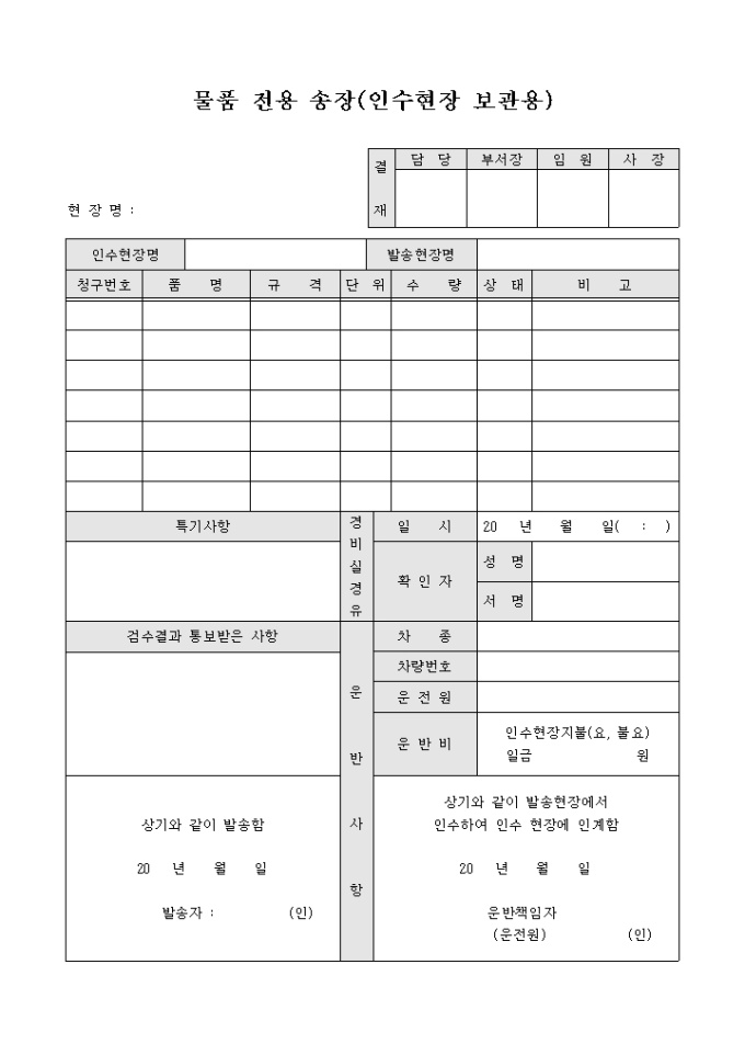 물품전용송장(인수현장보관용)