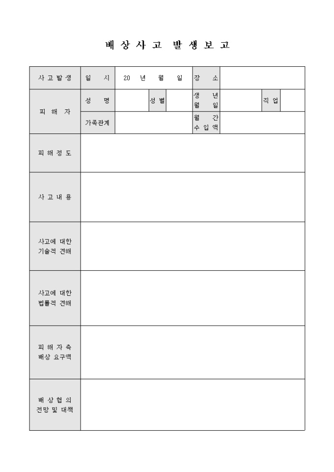 9,000원/월사고발생내용,피해자인적사항,피해정도,피해자측 배상요구액을 기록하는 배상사고발생보고서입니다.