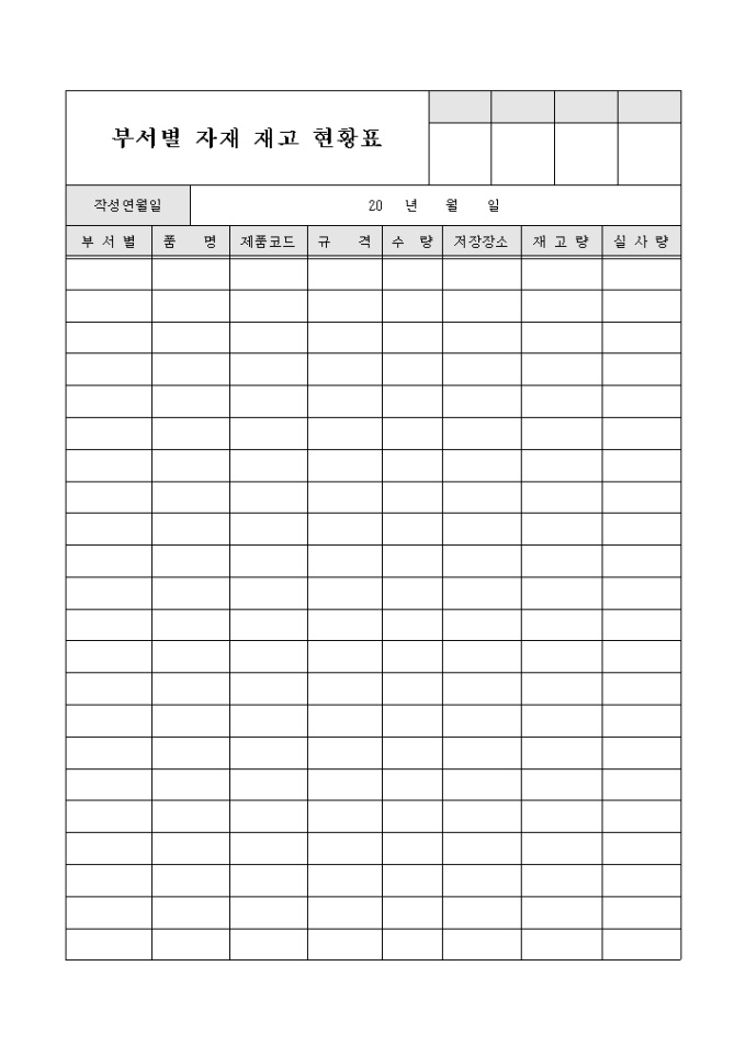 9,000원/월부서별 자재 재고 현황표로 품목, 규격, 수량, 재고량, 실사량등 재고 현황을 파악할 때 사용가능한 양식입니다.