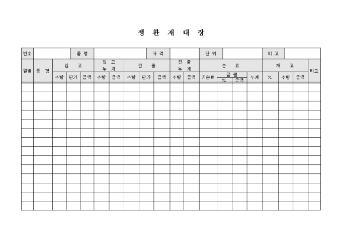 9,000원/월생환재대장 양식입니다. 날짜별 품명, 입고, 입고누계, 전출, 전출누계, 손료, 재고 등의 항목으로 구성되어 있습니다.