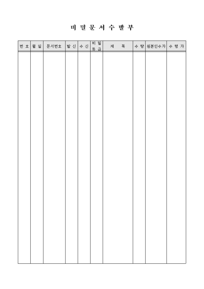 9,000원/월비밀문서 수발시 사용하는 서식으로 문서번호, 발신, 수신, 비밀등급, 제목, 수량등의 항목으로 구성되었습니다.