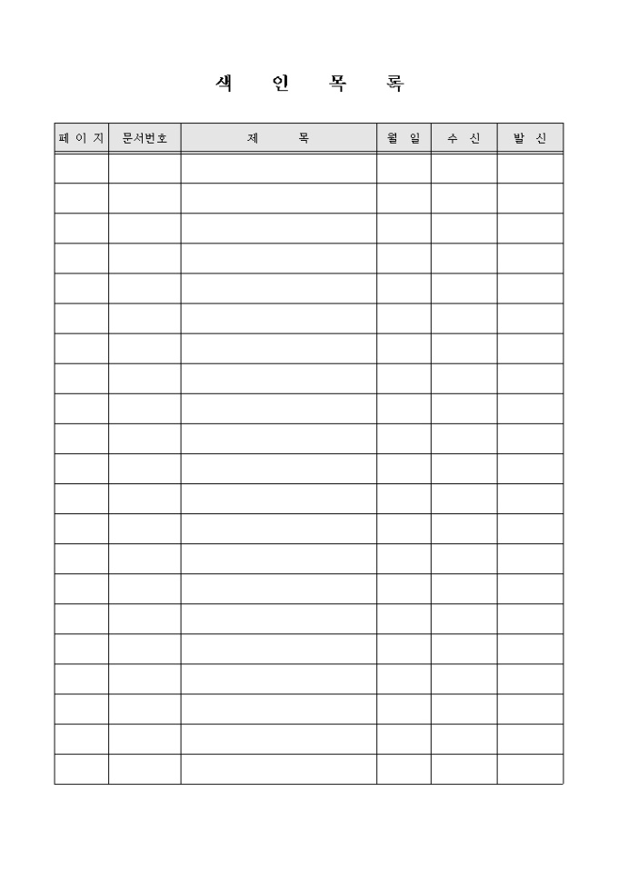 페이지,문서번호,제목,월일,수신,발신을 기록하는 색인목록표입니다.