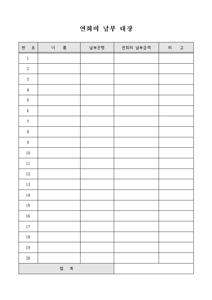 9,000원/월연회비 납부를 기록할때 이름, 납부은행, 납부금액 등을 기록할수 있는 납부대장입니다.