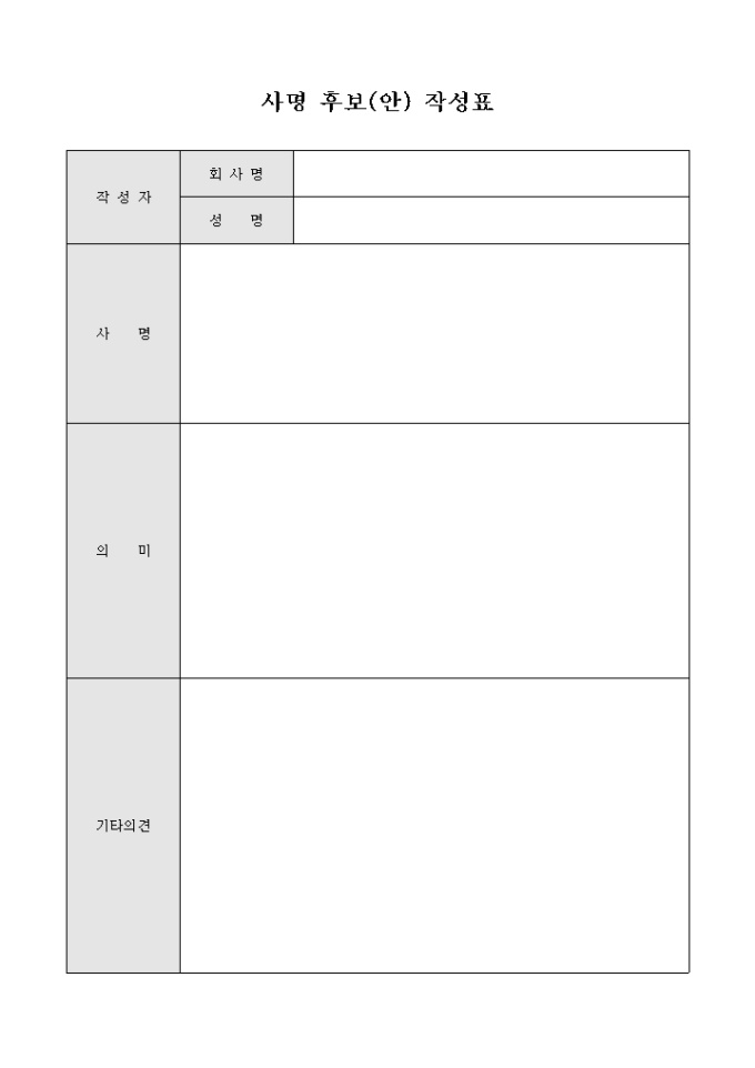 9,000원/월작성자, 사명, 의미, 기타의견으로 구성된 사명후보안 작성표입니다.