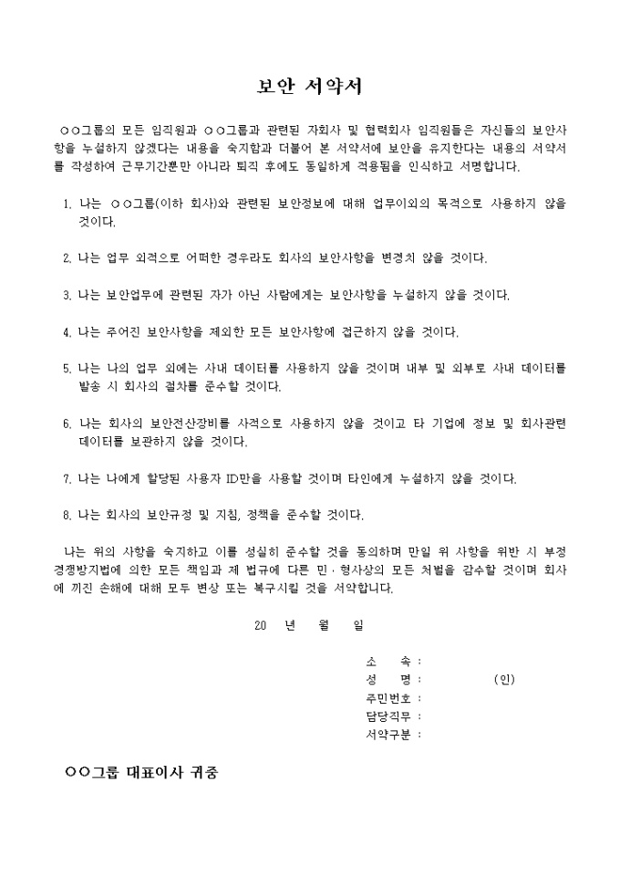 9,000원/월근무기간뿐 아니라 퇴직 후에도 일정기간 적용될 수 있는 보안내용을 숙지하고 서약한다는 내용의 임직원 보안서약서입니다.