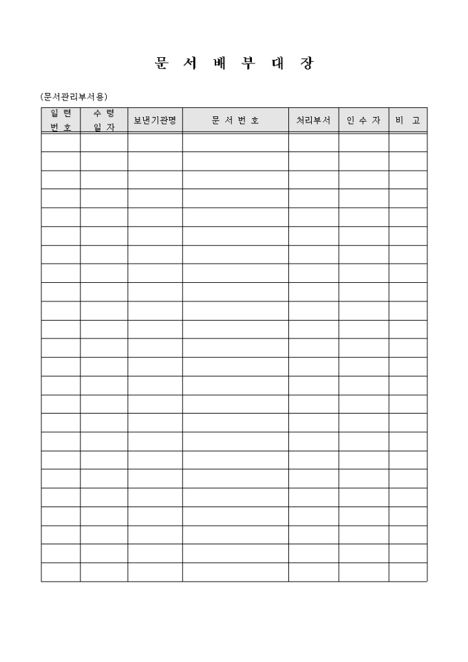 9,000원/월일련번호, 수령일, 보낸기관명, 문서번호, 처리부서, 인수자, 비고란으로 구성된 문서배부대장입니다