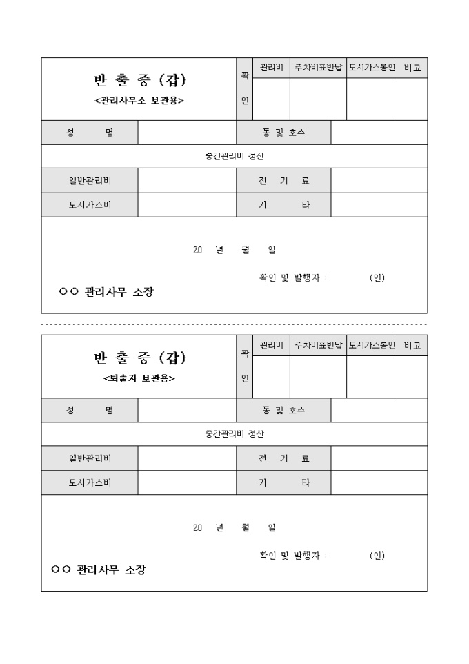 아파트 퇴거시 사용되는 양식으로 관리사무소 보관용과 경비실 제출용 반출증으로 구성되어 있습니다.