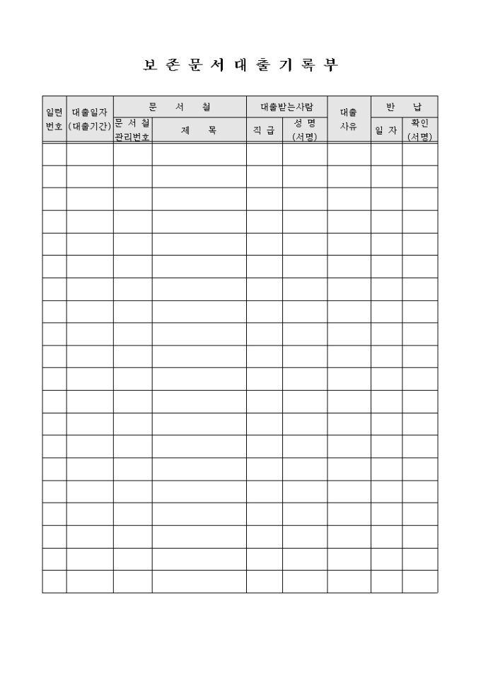 9,000원/월일련번호, 대출일자, 문서철, 대출받는 사람, 대출사유, 반납 등의 항목으로 구성된 대출기록부입니다.