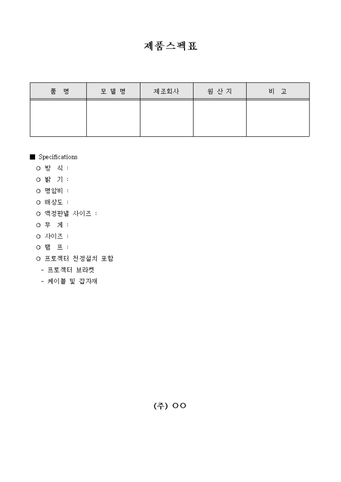 전자제품의 특징들을 기록는 서식이며 밝기, 사이즈, 램프, 해상도 등이 적혀 있으며 목적에 맞게 변경하셔서 사용하셔도 됩니다.