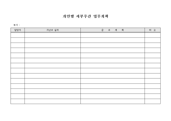 9,000원/월개인 세부 주간 일정을 계획하는 서식으로 지난주 실적, 금주 계획등을 기입하실 수 있습니다