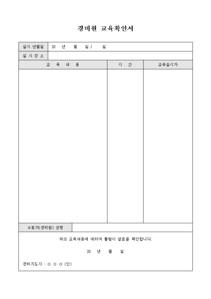 9,000원/월경비원 교육후 교육내용, 시간, 교육실시자등을 표기하며 교육확인을 할 수 있는 서식입니다.
