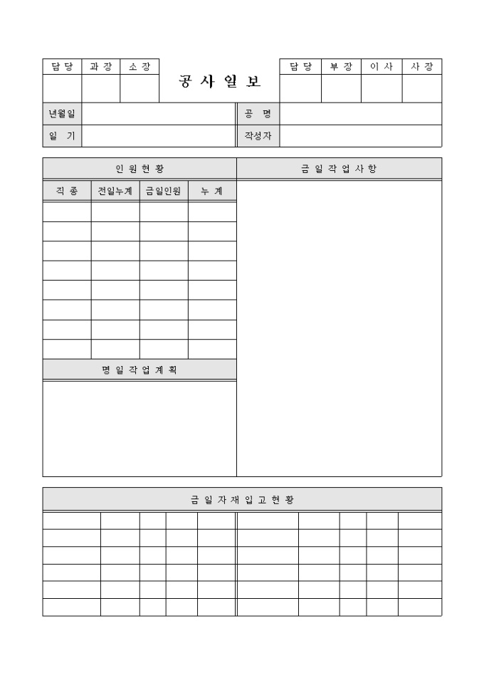 공사인원현황, 금일작업사항, 명일작업계획 등을 기재할 수 있게 만든 공사일보입니다.