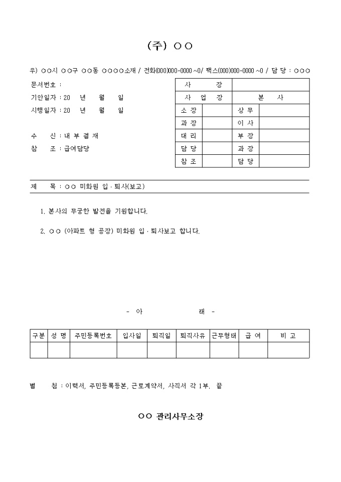9,000원/월미화원 입퇴사 내용을 포함한 기안문입니다.