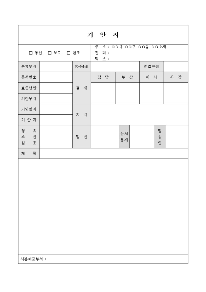 9,000원/월기안서로 결제란과 문서번호, 수신, 발신, 기안일자, 기안자, 제목, 사본배포부서 등의 항목으로 구성되었습니다.