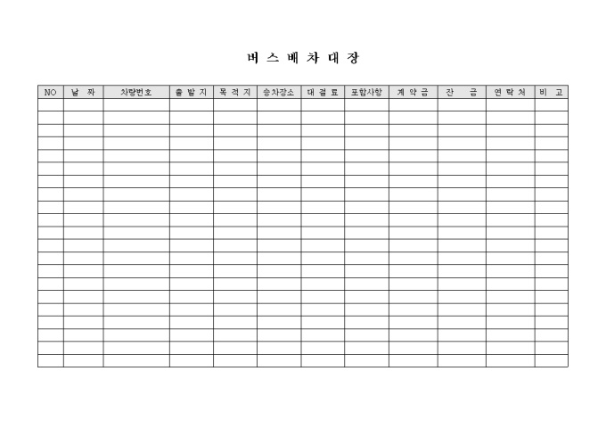 버스배차대장으로 날짜, 차량번호, 출발지, 목적지, 승차지, 대절료, 포함사항, 계약금, 잔금, 연락처, 비고란으로 구성되었습니다.