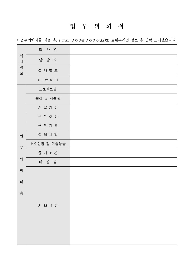 9,000원/월업무의뢰서로 회사정보, 업무의뢰 등의 세분화된 항목으로 구성되어 있습니다.