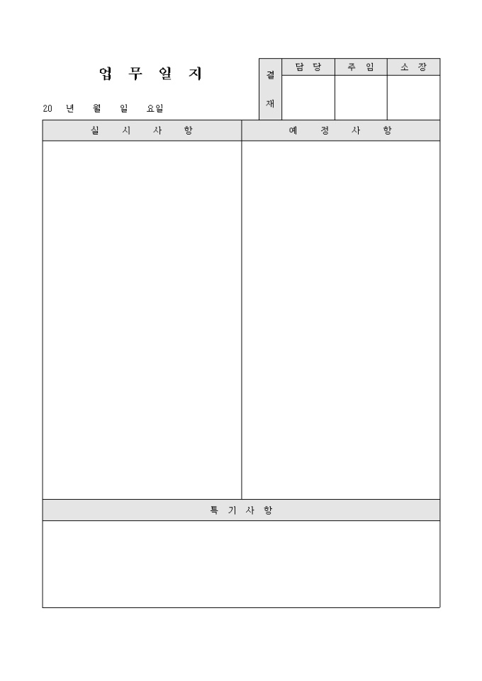 간단한 업무일지로 실시사항, 예정사항, 특기사항으로 구성되었습니다.