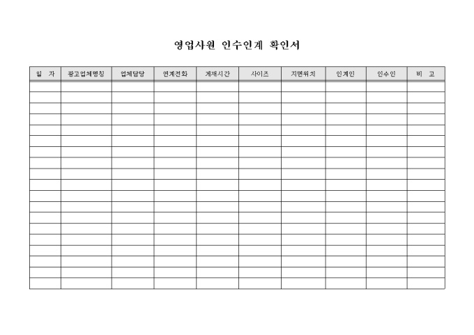 9,000원/월제품광고를 담당하는 사원들이 이용할 수 있는 인수인계 확인서 양식입니다. 담당 광고업체와 광고게재시간, 사이즈, 지면위치 등의 항목으로 구성되어 있습니다.